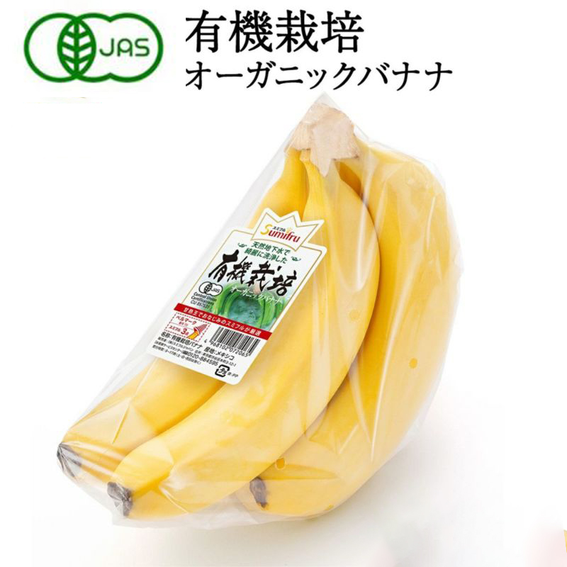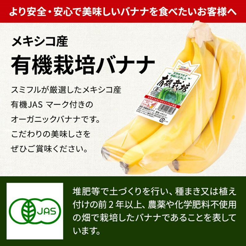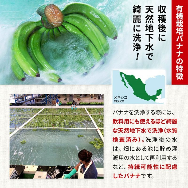 有機農産物の日本農林規格(有機JAS)認証はもちろん、全米オーガニックプログラム(NOP)制度認証、EUの有機農業規則に従って生産された蓄・農産物の証明、メキシコ農畜水産農村開発食料省が認証する証明を受けた園地で栽培したバナナです。