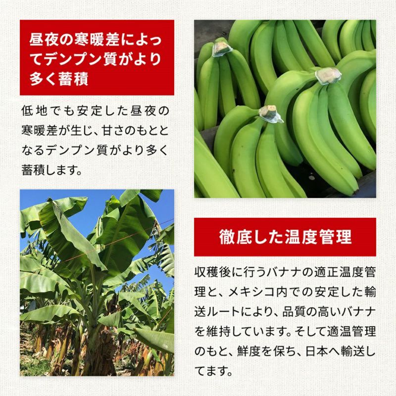 一般的なバナナ(フィリピン産・低地栽培バナナ)に比べ、昼夜の寒暖差がある農園で栽培しているため、糖酸バランスが良く ねっとりとした食感と甘さが特徴です。